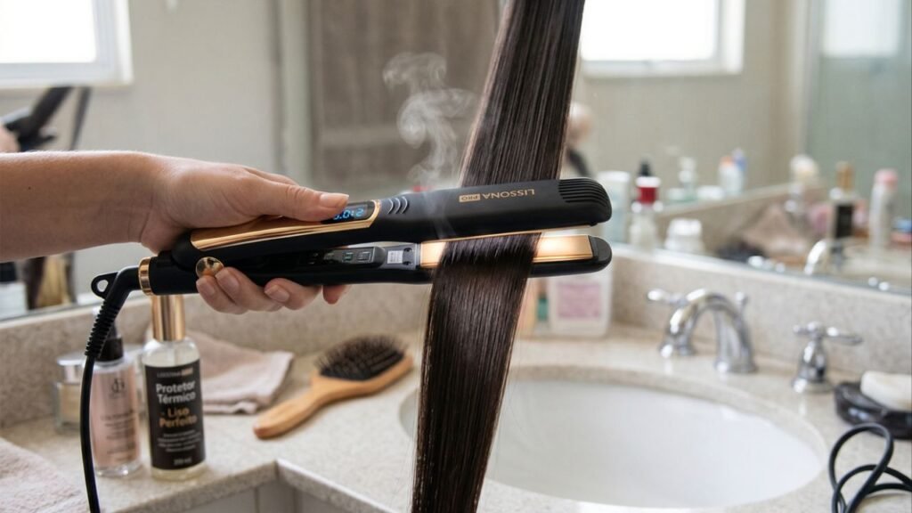 O protetor térmico é indispensável, pois cria uma película protetora ao redor de cada fio, reduzindo a perda de umidade e a exposição direta ao calor. Embora não elimine totalmente o impacto térmico, ele suaviza os efeitos, auxilia na manutenção da maciez e do brilho, e facilita o deslizamento das placas. Para sua eficácia, o produto deve ser aplicado em cabelos limpos, levemente úmidos ou secos, antes de qualquer ferramenta de calor, e espalhado de forma homogênea para evitar sobrecarga. Além disso, dividir o cabelo em mechas finas favorece um alisamento mais uniforme, diminuindo a necessidade de repetição e evitando a concentração de calor em uma mesma área do fio, uma técnica demonstrada pela especialista Viane Flloriano para um acabamento de salão.
